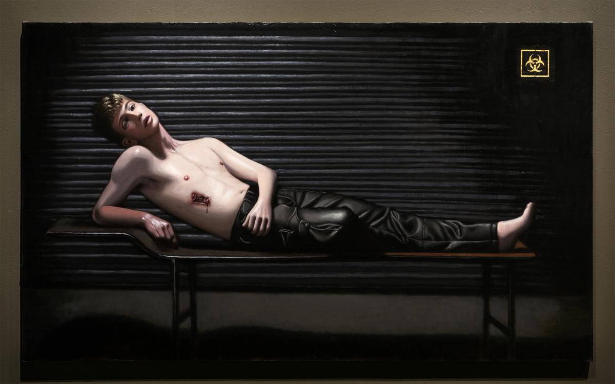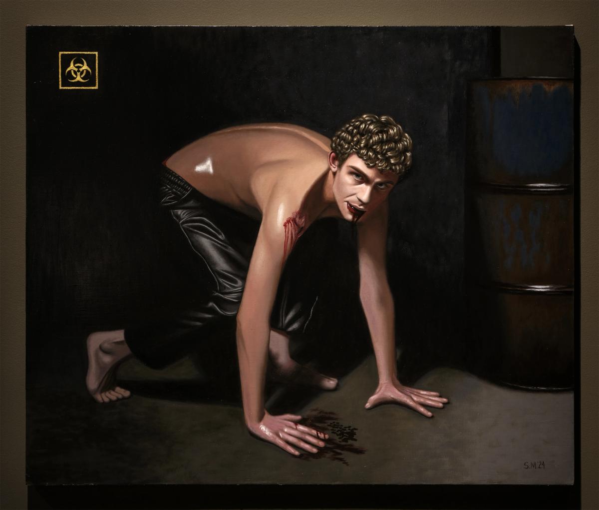 Each scene on view contributes to an intricate tapestry of hyper-detailed beasts and young men that haunt and mesmerize in equal measure. Miguels’ figures, ambiguous and unsettling, engage the viewer with vacant or knowing stares that question who is the observer and who is the observed. Resisting clear categorization, they verge on the feral, posed tensely on the cusp of transformation, as if teetering between submission and rebellion. Set against stark, decaying industrial environments, these figures resonate with a sense of dystopian abandonment, amplifying the rawness of their primal expressions.