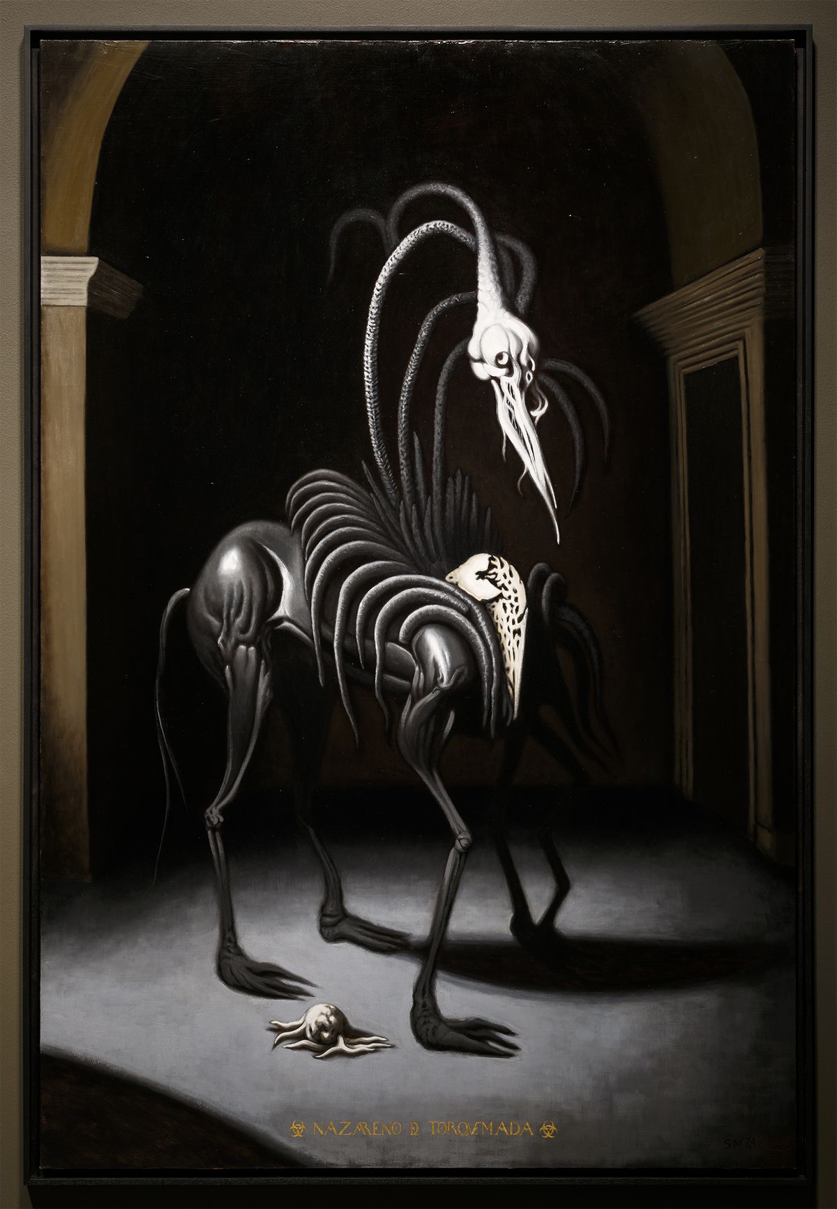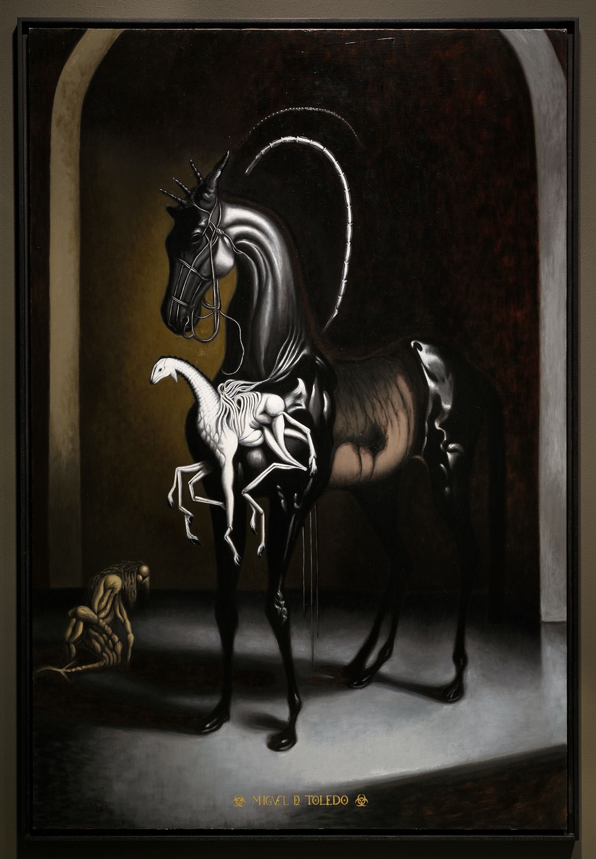Alongside, Miguel introduces sinewy, otherworldly creatures—beings that straddle the line between human and animal and embody both allure and dread. These hybrid forms evoke a dark familiarity, as though emerging from an ancient subconscious. In shadowy, desolate backdrops, they linger timelessly, suspended in an enigmatic state that defies resolution. The result is a hauntingly enveloping exhibition that urges its viewers to confront both the grotesque and the sublime within the liminal spaces of history, identity, and the unknown.