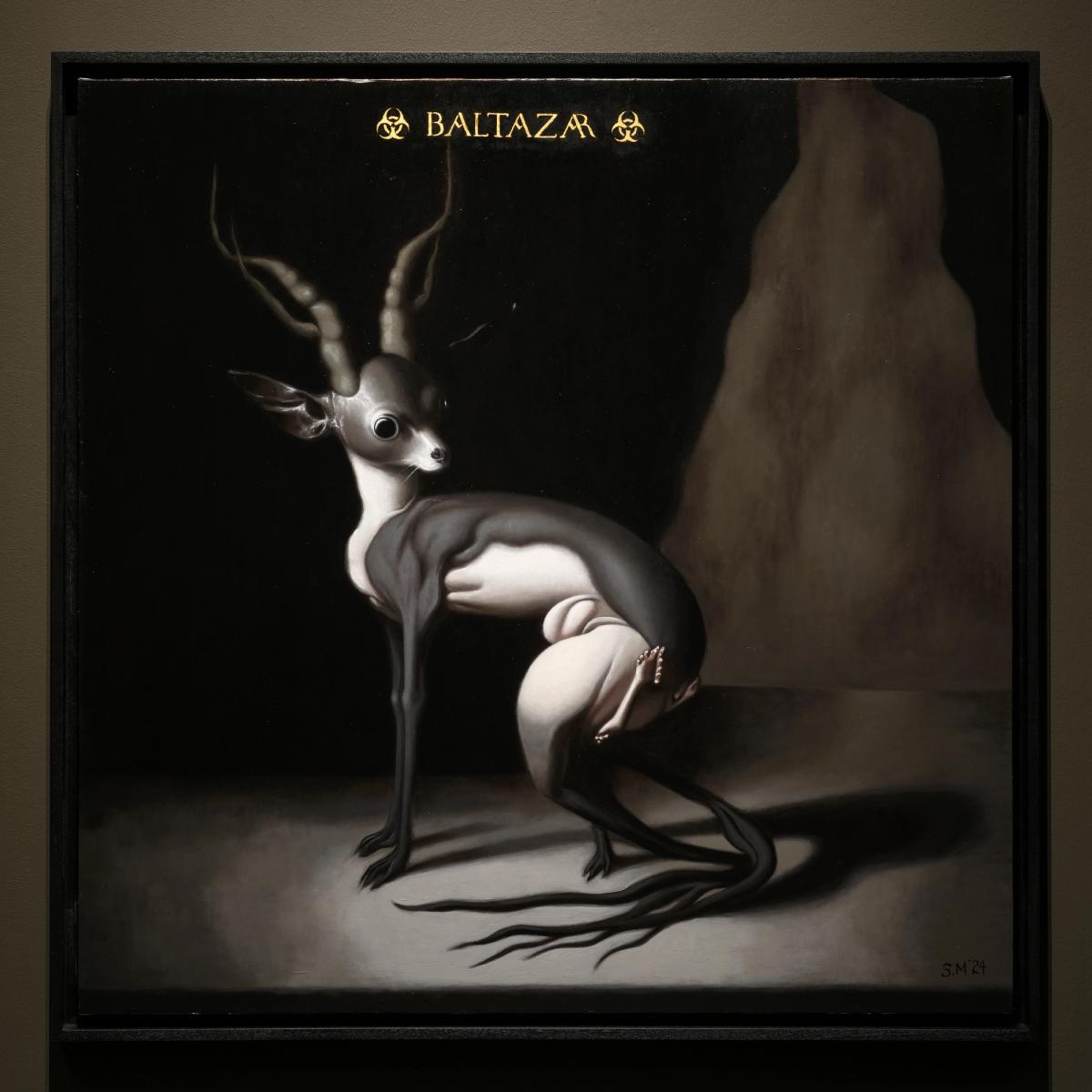 This project took shape in works displayed previously at Company, as part of the group exhibition, De Por Vida (2021), and then later in his solo show at Deli Gallery, Army of Angels (2022) which, moving from the Viceroyalty of New Spain to that of Peru, offered a surprising take on the 17th-century genre of arquebusier angels —Andean noblemen depicted as militant yet saintly figures. By transforming the angels into devious, divine women, Miguel injected a subversive femininity into classical Renaissance archetypes, thereby challenging the visual codes of religious art. In Balada de la Inquisición, Miguels’s interest in this symbolism evolves further, with neo-medieval beasts, Baconian grotesques, and Goya-esque eccentricities populating compositions that blend the familiar with the fantastical. The paintings traverse beyond identity, adopting an instinctual style that explores themes of isolation, transformation, and the visceral dimensions of nature and subjecthood.