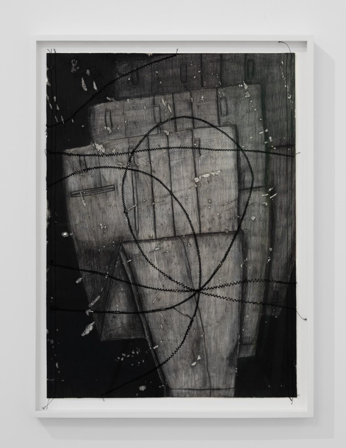 Though the pachuca and zoot suit or ‘el tacuche’ features heavily in the show as a gendered symbol for a spectrum of rebellion within the United States, it’s also a tool in a search for evidence related to the nature of identity. Pieces like diagrams stitch together chaotic points of reference in an effort to decipher a disparate collection of archival remnants. It feels like Montes Michie is chasing a silent ancestor removed, especially with the piece ‘Ramona.’ The outlined image of a Chicana garment worker photographed in a zoot suit in 1943 named Ramona Fonseca becomes a blueprint for our projections. Ramona’s abstracted form is now the baseline pattern from which to be layered, sampled, and inserted into a new narrative.