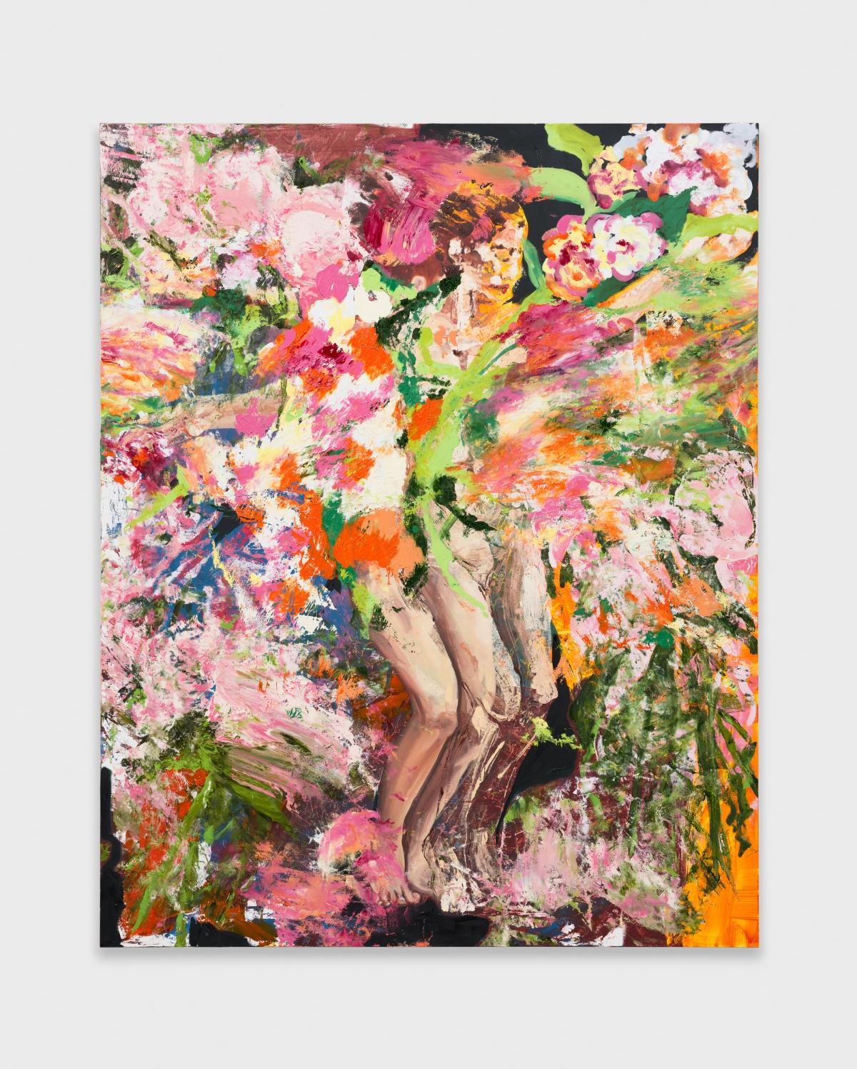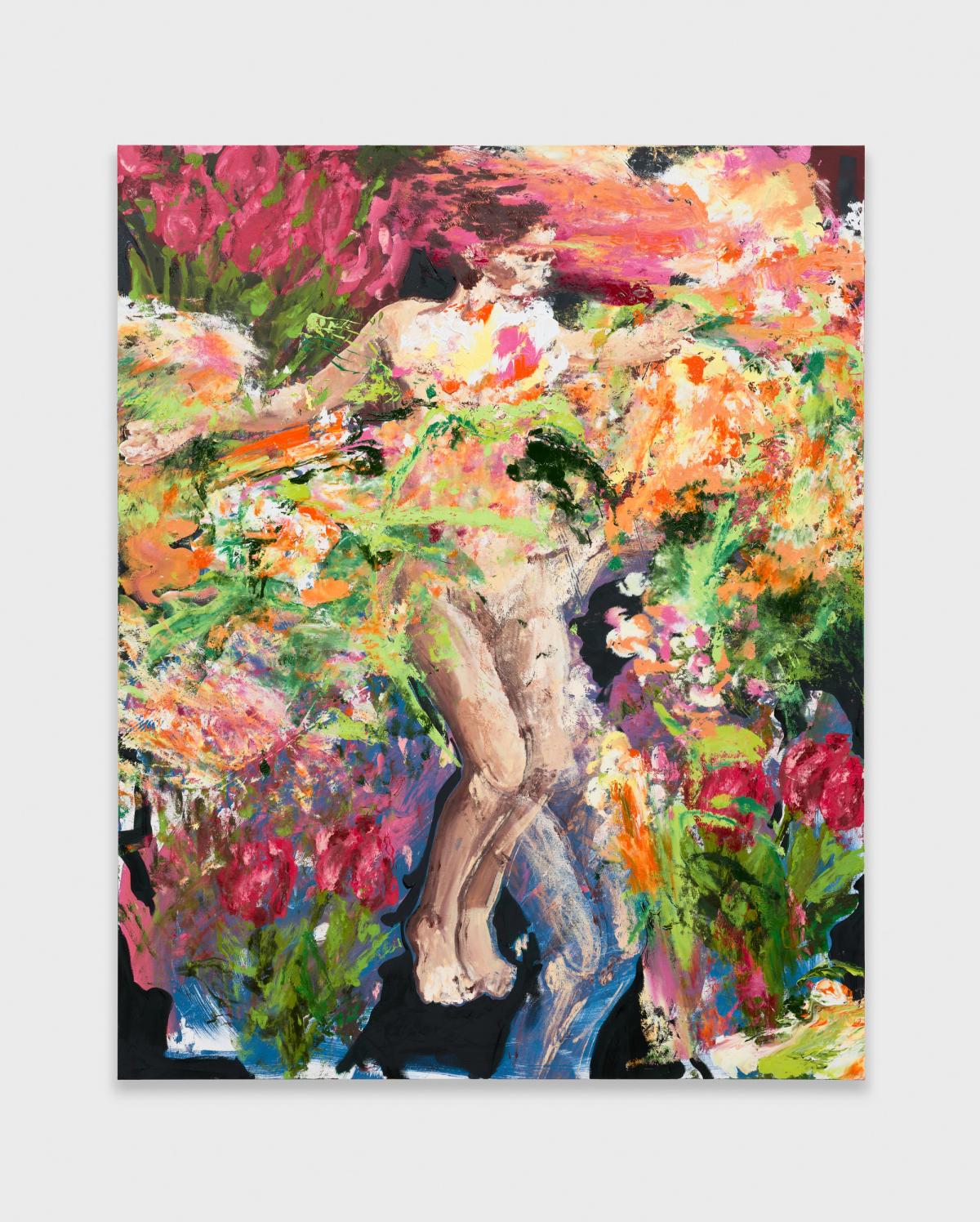 In one series on view, Paul Cézanne’s A Modern Olympia (c. 1873–74) serves as a pivotal point of reference: its mercurial figure recurs throughout, splintered and reassembled through a choreography of transfer, pressure, and erasure. Alongside, a second body of work draws from the promotional poster for the 1999 film American Beauty, with its iconic image of a nude woman nestled in a bed of roses. The composition, with its luminous flesh and floral surround, carries a distinctly Christ-like charge, collapsing sacred and profane registers into a single, seductive image.