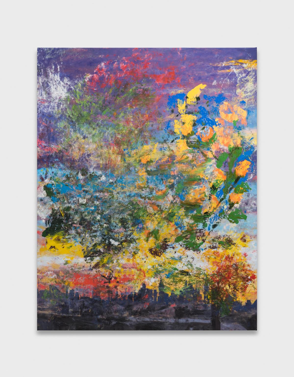 Across the exhibition, lush romantic tones press against one another in dense, tactile layers that echo the expressive force of Joan Mitchell and the material experimentation of Sam Gilliam. In particular, Gilliam’s Whirlirama (1970) with its ghostly impressions left by plastic pulled from wet pigment, offered a model for Mundt’s own play between exposure and concealment. Through a similar rhythm of recurrence and transformation, she probes painting’s ability to register movement and duration, turning the surface into a site of charged accumulation where intention and accident converge and each gesture is preserved in the skin of the work.