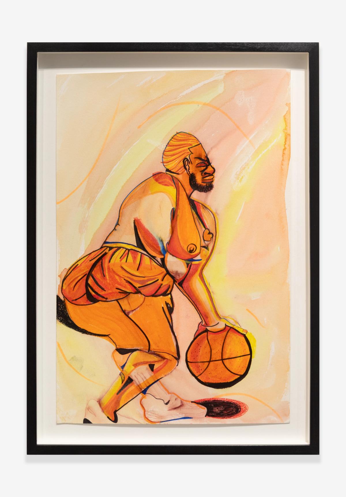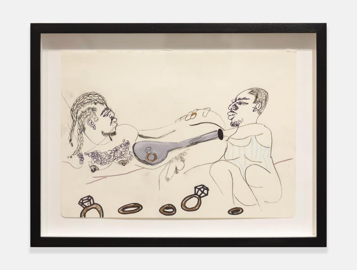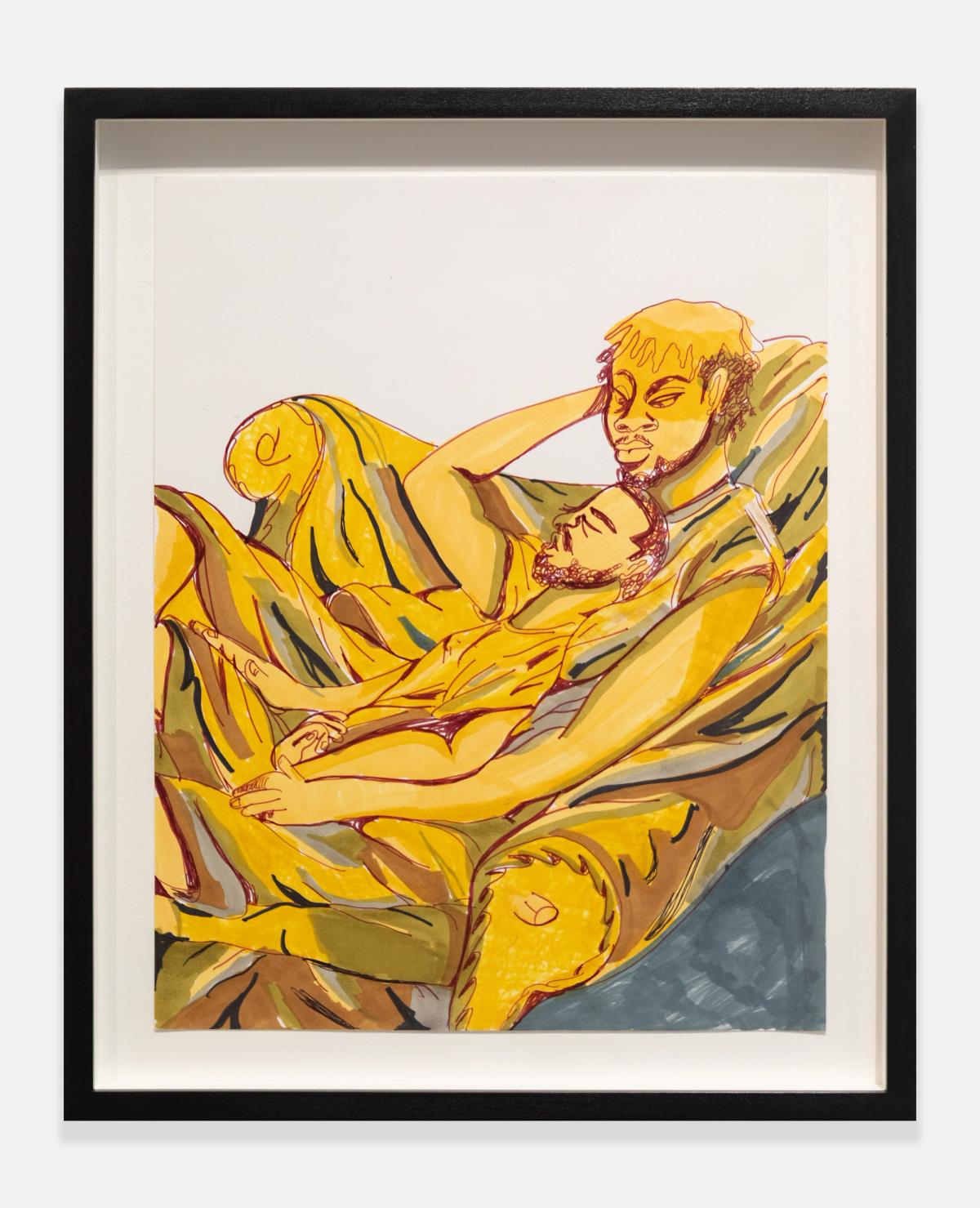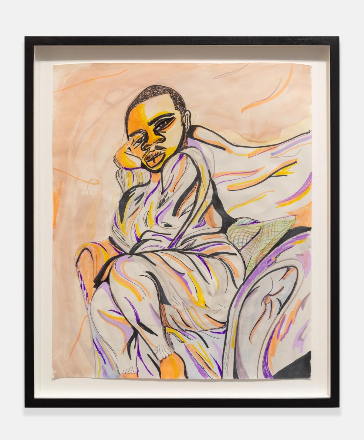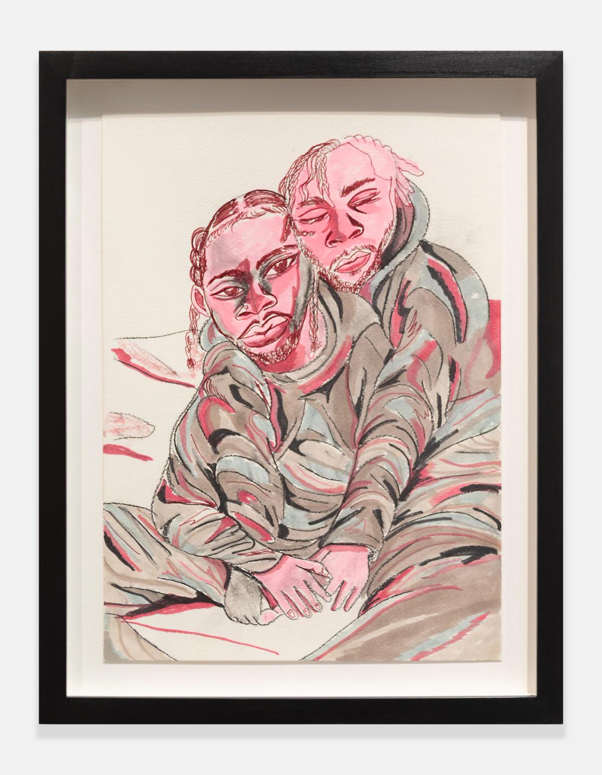 Often made after the paintings, Chase’s works on paper serve as points of return rather than replication. While painting is spontaneous and gestural, their sketches unfold slowly, with a more deliberate touch. Stripped of cityscapes and explicit settings, they inhabit a suspended space between the tangible and the imagined, emphasizing form and control over fluidity and release. “It’s not a one-way journey,” Chase explains. “The paintings form the basis of the drawings.” Through the direct movement of hand across paper, each mark holds resonance, capturing the intimacy of communication within these notations. This physical connection establishes a deliberate exchange between the artist and the page, where traces of the body register thought, rhythm, and emotion.