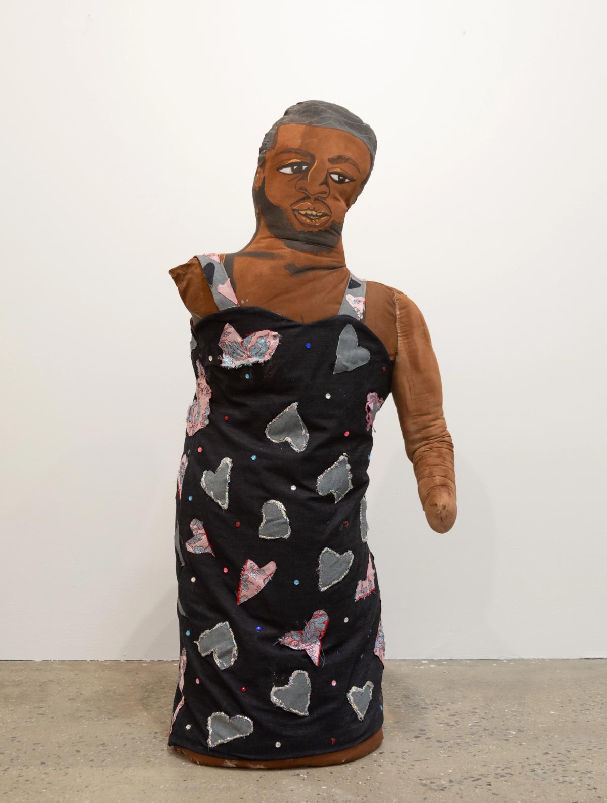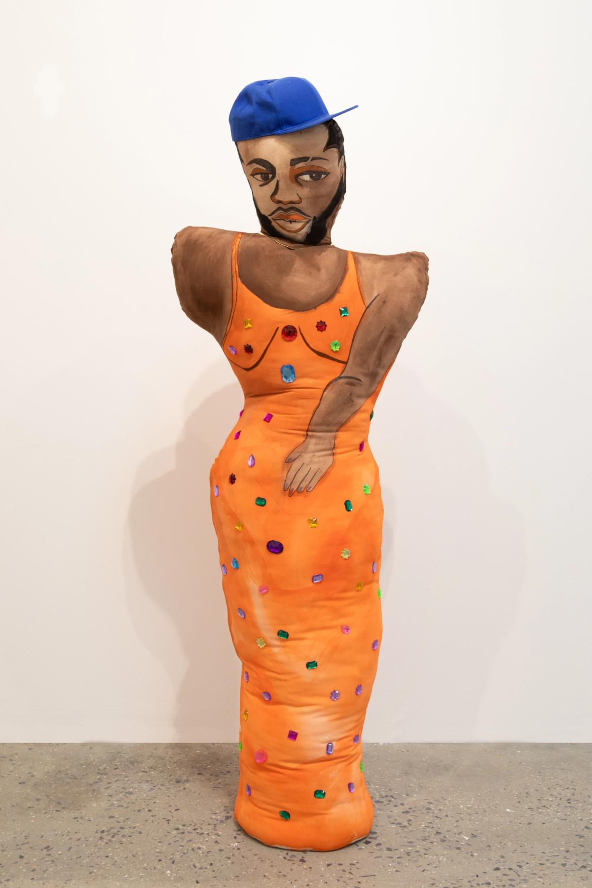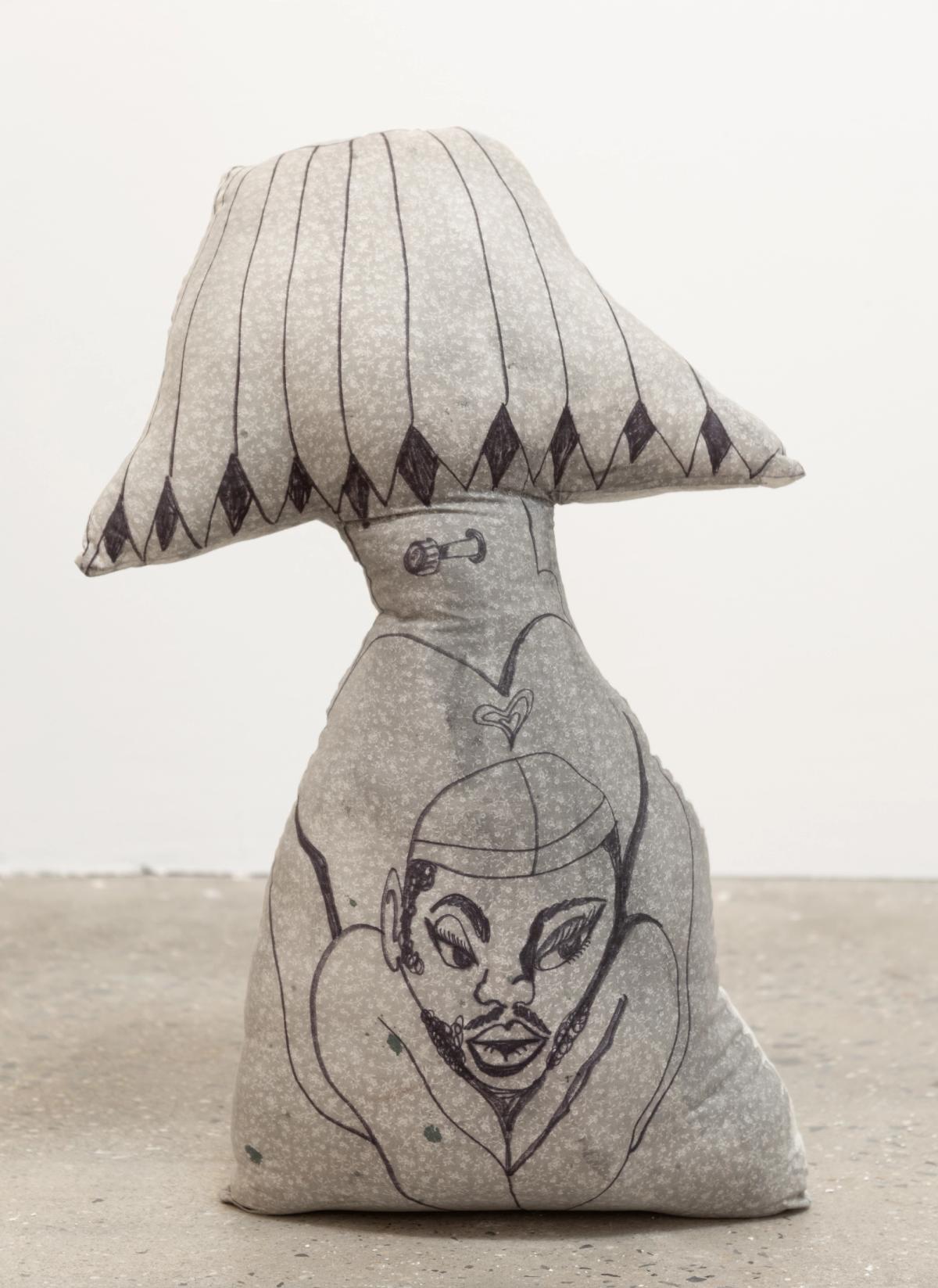 Within the gallery, a row of works is installed in sequence, echoing the framework of Chase’s sketchbooks. This arrangement reflects a system of organizing and archiving that is both methodical and deeply personal. Alongside these works, soft sculptures extend from the drawn figures into the physical space. Their rounded forms carry the haptic, intimate qualities of sewing and handwork, emphasizing touch and materiality. Neither fixed portraits nor singular identities, these figures exist as mutable, embodied representations of the self and community.