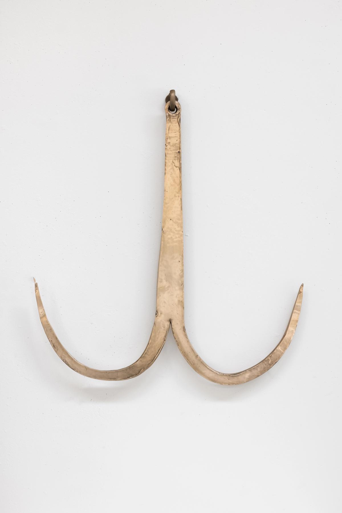 Sidsel Meineche Hansen’s interest in metalworking and casting lies beyond the material processes that she employs, incorporates, and sometimes makes explicit reference to in her practice. The utilitarian objects, anthropomorphized sex toys and religious figurines that are the impetus for several of Hansen’s artworks often refer to the physiological effects and sexual drives that manifest through labor and production. As such, these works often fall into two camps: individually, handmade pieces such as her recently steel-forged and bronze wax cast series Hooks (2023) based on designs of rudimentary meat hooks, while her remake of moulds used in both industrial and artisanal casting are emblematic of the mass-produced reproduction of objects.