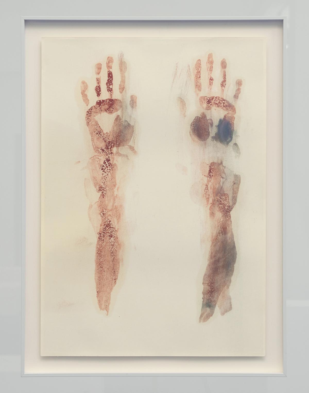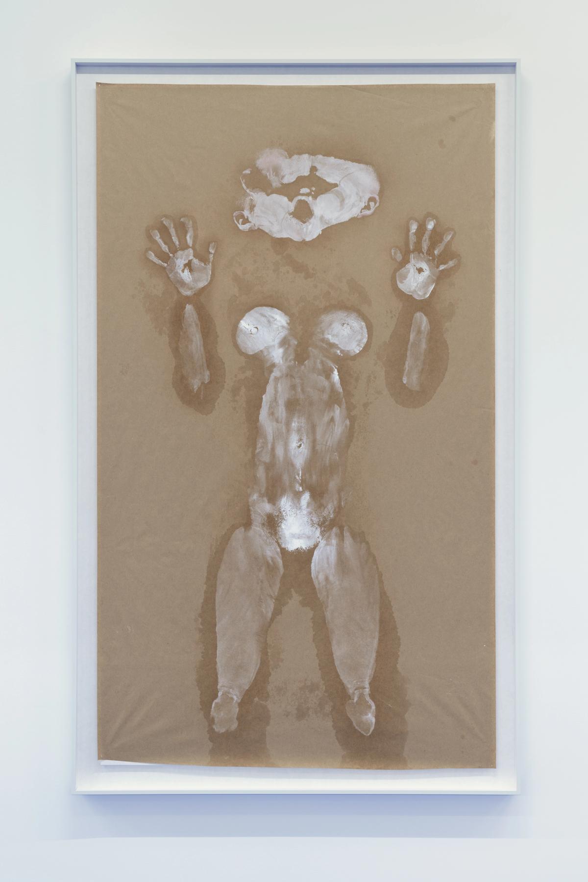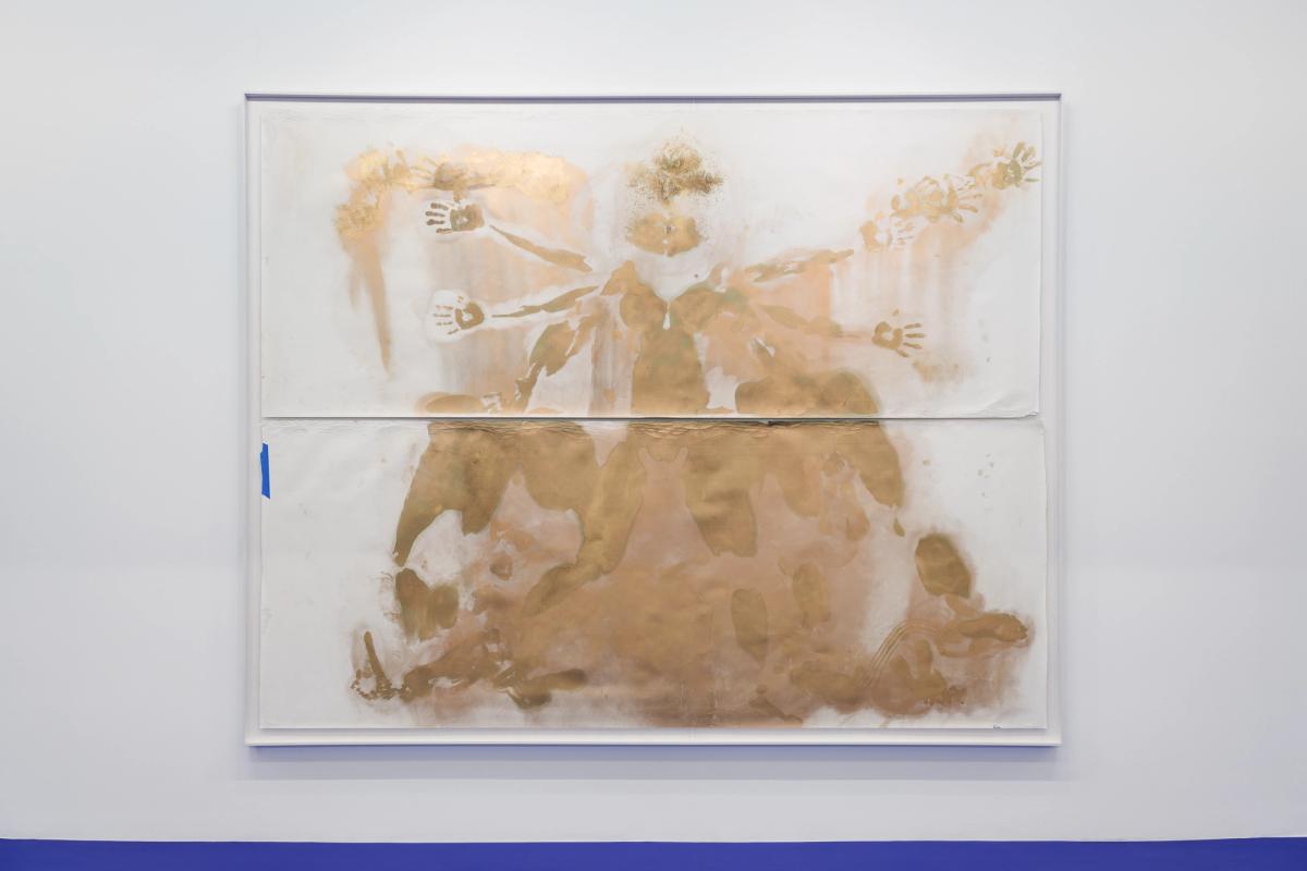 Eventually, the action of translation became the site for Basco’s corporeal approach to drawing and painting. She works with materials such as clown white paint, gold pigment, and theatrical blood powder, which were initially used in her performances. Covering her body in these materials, Basco uses her body weight to imprint marks on different surfaces, evoking motion, and bodily intimacy. Conceptually, this approach to painting-as-improvisation allowed Basco to illustrate gestures and entangled movements that would be impossible to render through other media.