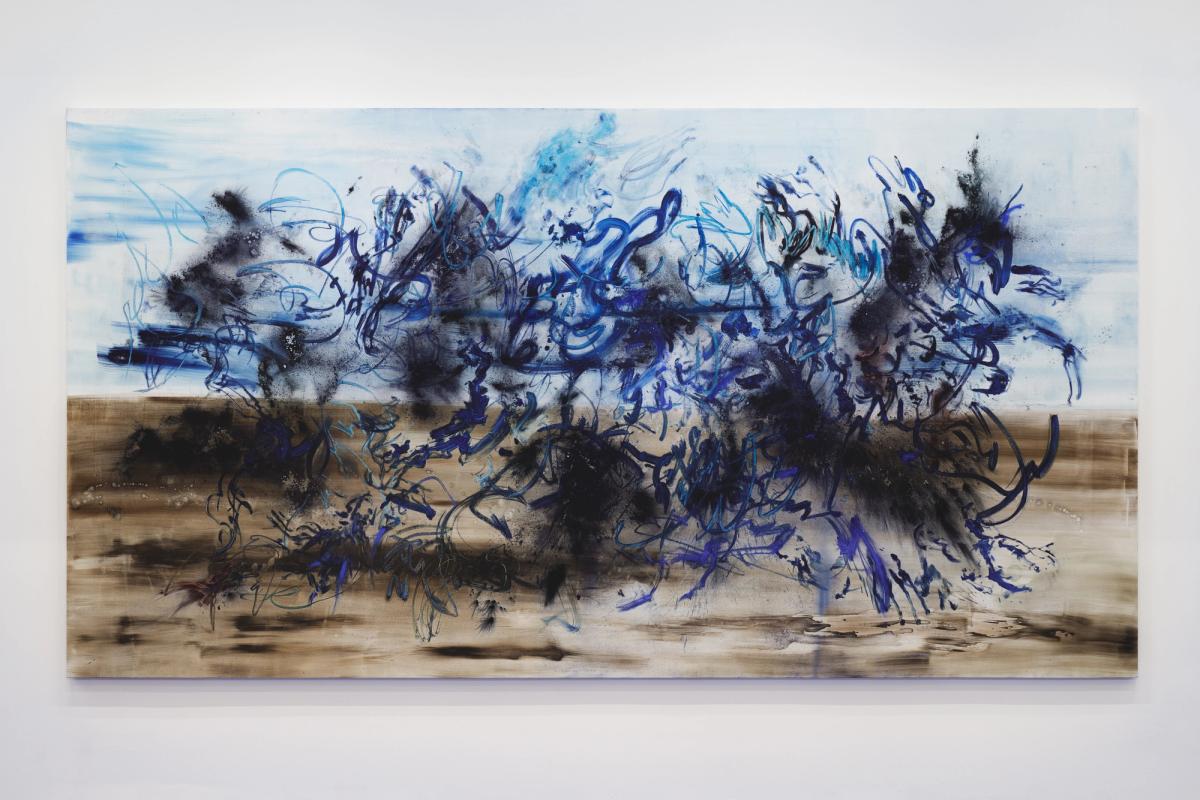 An installation of photographic works on the museum's fifth floor responds to the exhibition’s title: No Sky. It takes its name from a poem by the Lebanese-American poet and artist Etel Adnan (1925-2021), which addresses themes of dislocation and the impossibility of returning to a past or home. Under No Sky, the studio is the stage; performance is rehearsal; painting is touching; improvisation is a form of liberation.